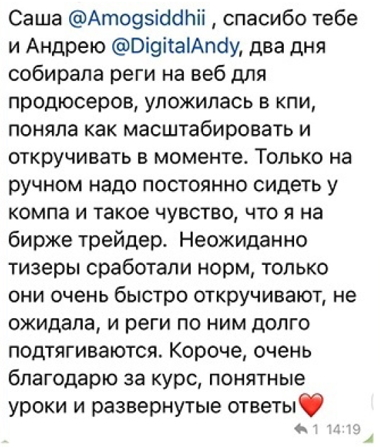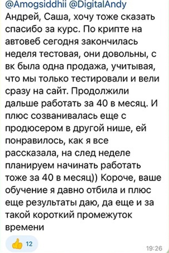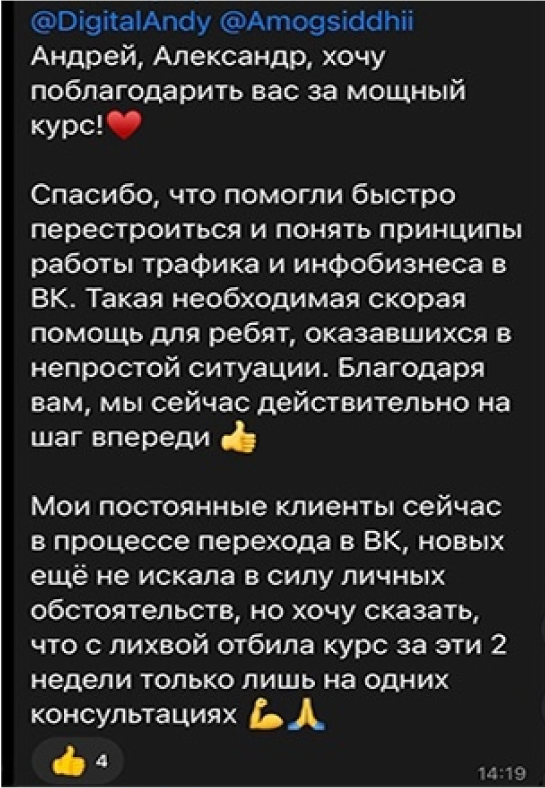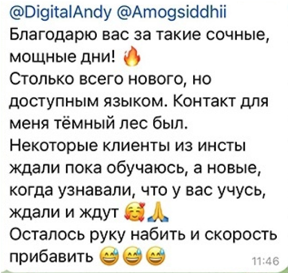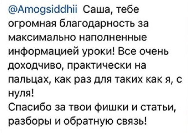 Спасибо за консультацию, она просто офигенная! Хочу, чтобы ты продавал свою консультацию дороже, потому что она стоит на 100% намного больше, чем то, что ты дал на консультации, информация максимально всеобъемлющая, могу точно сказать, что это одна из самых лучших консультаций, которые я когда-либо получал, я максимально доволен